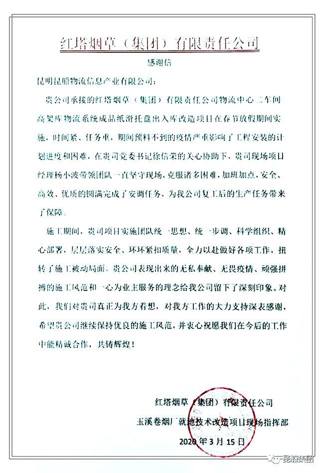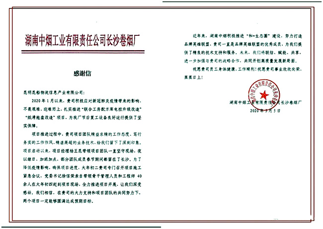 在疫情爆發(fā)之際,在春節(jié)假期之時,昆船物流公司領導、技術骨干紛紛組成突擊隊,奔赴玉溪卷煙廠、長沙卷煙廠等地,保障項目節(jié)點按期完成,他們的不畏困難、不提條件、主動請纓的精神深深的打動著所有人。